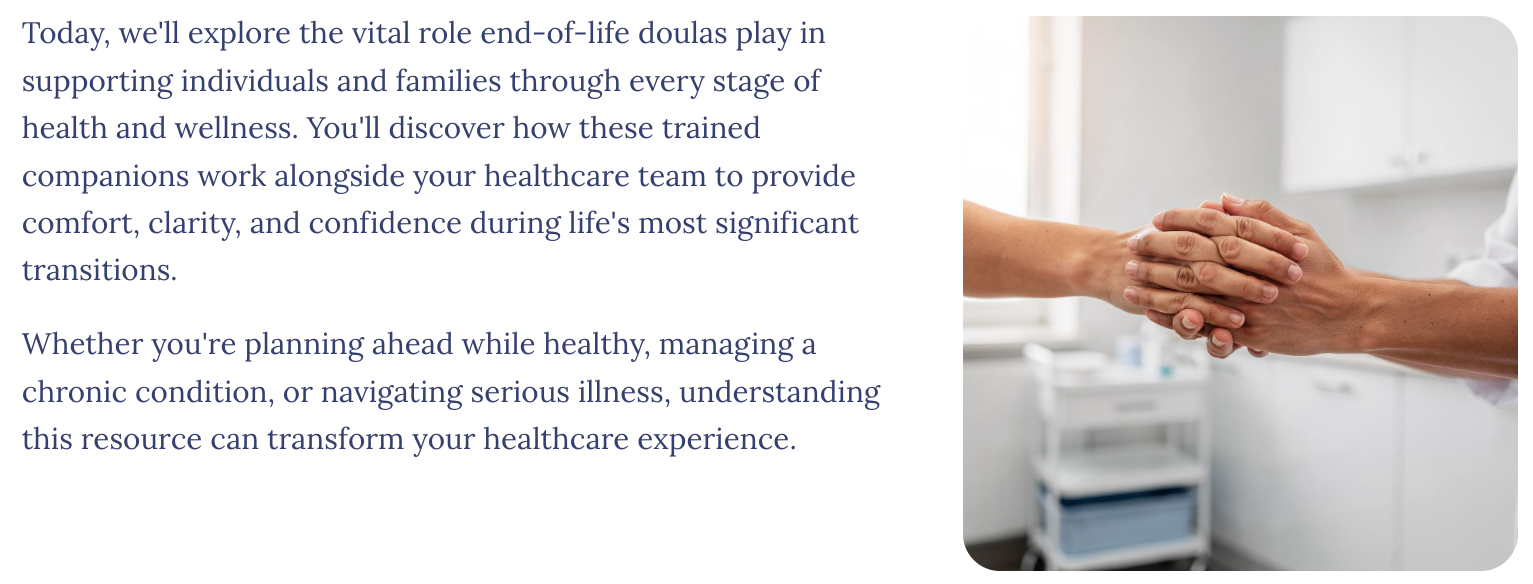 Enroll in "Understanding End-of-Life Doulas" today and gain the knowledge that transforms your healthcare experience from overwhelming to manageable, from frightening to supported.